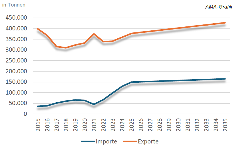 Die EU importiert den Großteil ihrer Eier – hauptsächlich Frischeier – aus der Ukraine und dem Vereinigten Königreich. In den letzten drei Jahren haben die ukrainischen Einfuhren deutlich zugenommen; 2023 und 2024 stammten rund 60 % der gesamten EU-Eierimporte aus der Ukraine. Bis 2035 dürften die Importmengen von derzeit 149.000 t Eiäquivalent auf voraussichtlich 164.000 t steigen, was einer jährlichen Wachstumsrate von 2,7 % entspricht. Trotz steigender Importe bleibt die Europäische Union damit weiterhin Nettoexporteur.
