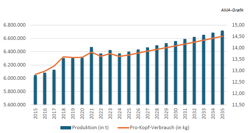 Der Pro-Kopf-Verbrauch dürfte bis 2035 von derzeit 13,7 kg auf 14,5 kg zunehmen und damit jährlich um 0,5 % wachsen. Die Nachfrage soll sowohl auf Konsumentenebene als auch seitens der verarbeitenden Industrie hoch bleiben. Mit steigenden Einkommen wird zudem eine wachsende Nachfrage nach Bio- und Freilandeiern erwartet.