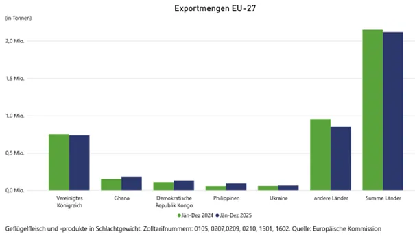 Im Gegenzug exportierten die Mitgliedsländer der Europäischen Union im selben Zeitraum rund 2,12 Mio. t Geflügelfleisch in Drittstaaten. Das entspricht einem leichten Rückgang von 1,5 % gegenüber 2024. Wichtigster Handelspartner bleibt Großbritannien, das mit knapp 737.000 t mehr als ein Drittel der EU-Lieferungen abnimmt. Dahinter folgen Ghana und die Demokratische Republik Kongo mit 177.000 t bzw. 133.000 t. Trotz der etwas geringeren Exportmengen konnten die EU-Mitgliedsstaaten ihre Erlöse im Jahr 2025 auf über 5,41 Mrd. Euro steigern (+9 %).