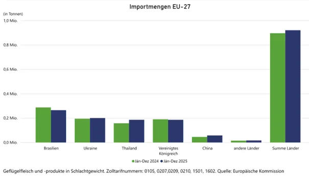Nach aktuellen Angaben der Europäischen Kommission stiegen die EU-Einfuhren von Geflügelfleisch im Jahr 2025 auf rund 921.000 t Schlachtgewicht. Das entspricht einem Zuwachs von 2,7 % gegenüber dem Vorjahr. Die Importmengen aus Brasilien sanken auf 265.000 t (-8 %). Die geringeren Liefermengen sind vor allem auf Importbeschränkungen nach einem Vogelgrippe-Ausbruch im Mai 2025 zurückzuführen. Trotz dieses Rückgangs bleibt Brasilien das wichtigste Herkunftsland für die Europäische Union. Aus der Ukraine, dem zweitwichtigsten Herkunftsland, stiegen die Einfuhren auf insgesamt rund 200.000 t (+3 %). Die ukrainische Produktion erholte sich 2025 zwar vom kriegsbedingten Einbruch, viele Betriebsabläufe sind wegen der instabilen Stromversorgung aber weiterhin gebremst.