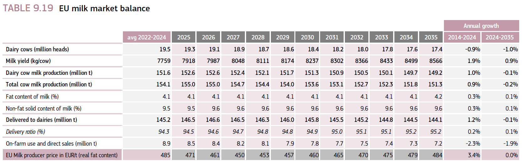 Die Milchmenge von derzeit 7.759 kg je Kuh (Durchschnitt 2022-2024) wird demnach auf 8.566 kg im Jahr 2035 zunehmen. In einigen osteuropäischen Ländern, wie z.B. Polen könnte sich der Trend der steigenden Milchproduktion der letzten Jahre fortsetzen. Viele EU-Mitgliedsstaaten, die in der Vergangenheit das Wachstum der Milcherzeugung vorangetrieben haben, stoßen jedoch an ihre Grenzen, wenn es um weitere Produktivitätssteigerungen geht. Gleichzeitig stehen Länder, wie etwa die Niederlande, Belgien und Dänemark unter Druck, strengere Umweltziele zu erreichen, insbesondere zur Verringerung von Stickstoffemissionen. Der EU-Milchviehbestand wird voraussichtlich von derzeit 19,5 Mio. Milchkühen (Durchschnitt 2022-2024) auf 17,4 Mio. bis zum Jahr 2035 sinken (-11 %).