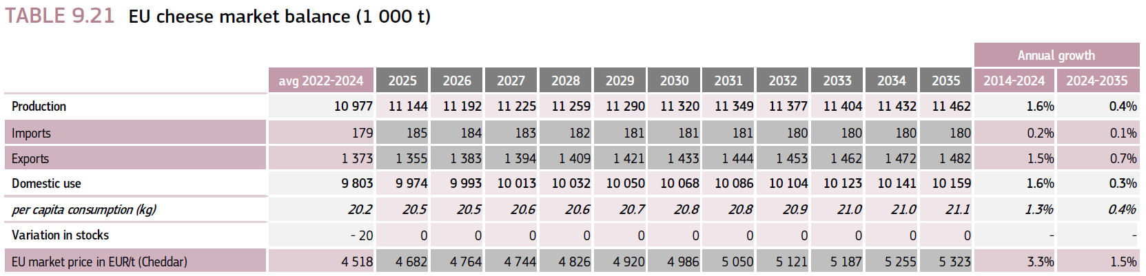 Der Bericht geht davon aus, dass der starke Inlandsverbrauch und die steigende Importnachfrage einen weiteren Anstieg der EU-Käseproduktion fördern werden. Käse bleibt weiterhin das wichtigste Exportprodukt der EU. Die Ausfuhren sollen bis 2035 um 0,7 % pro Jahr steigen. Der Pro-Kopf-Verbrauch könnte trotz Preisinflation ebenfalls leicht zulegen auf 21,1 kg (+0,4 % pro Jahr). Innerhalb der weißen Palette dürfte der Konsum von Frischmilch in den kommenden zehn Jahren weiter zurückgehen (-1 % jährlich). Der Pro-Kopf-Verbrauch von Joghurt soll stabil bleiben, der Konsum von Sahne könnte leicht anziehen (+0,2 % jährlich). Der Gesamtverbrauch der weißen Palette in der EU dürfte ähnlich stark zurückgehen wie im letzten Jahrzehnt (-0,5 % pro Jahr).
