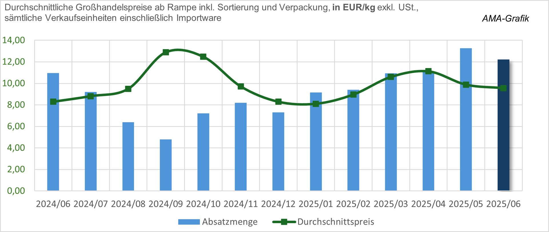 Der AMA- Großhandelsabgabepreis inkl. Importware für Heidelbeeren, frisch wurde im Juni mit durchschnittlich 9.56 EUR/kg auf schwachen Vormonatsniveau, 15 % über Vorjahr bewertet. Die Absatzmenge zeigt sich dem Saisonzeitpunkt entsprechend stabil.