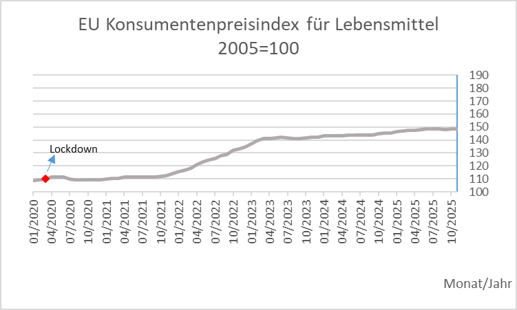 Im Monatsvergleich stieg der EU-weite Verbraucherpreisindex (HVPI) für den Teilindex Lebensmittel im November 2025 gegenüber dem Vormonat um + 0,2 %.